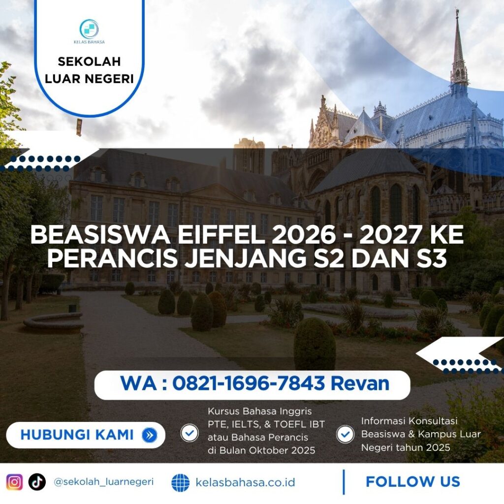 Peluang beasiswa Pemerintah Perancis kembali dibuka. Eiffel Excellence Scholarship Programme atau biasa disebut Beasiswa Eiffel kini tersedia untuk tahun akademik 2026 – 2027. Pelajar dari tanah air salah satu yang berkesempatan memperoleh beasiswa ini. Beasiswa Eiffel menjaring mahasiswa-mahasiswa internasional berbakat untuk melanjutkan studi mereka pada tingkat master maupun doktor di universitas-universitas Perancis.